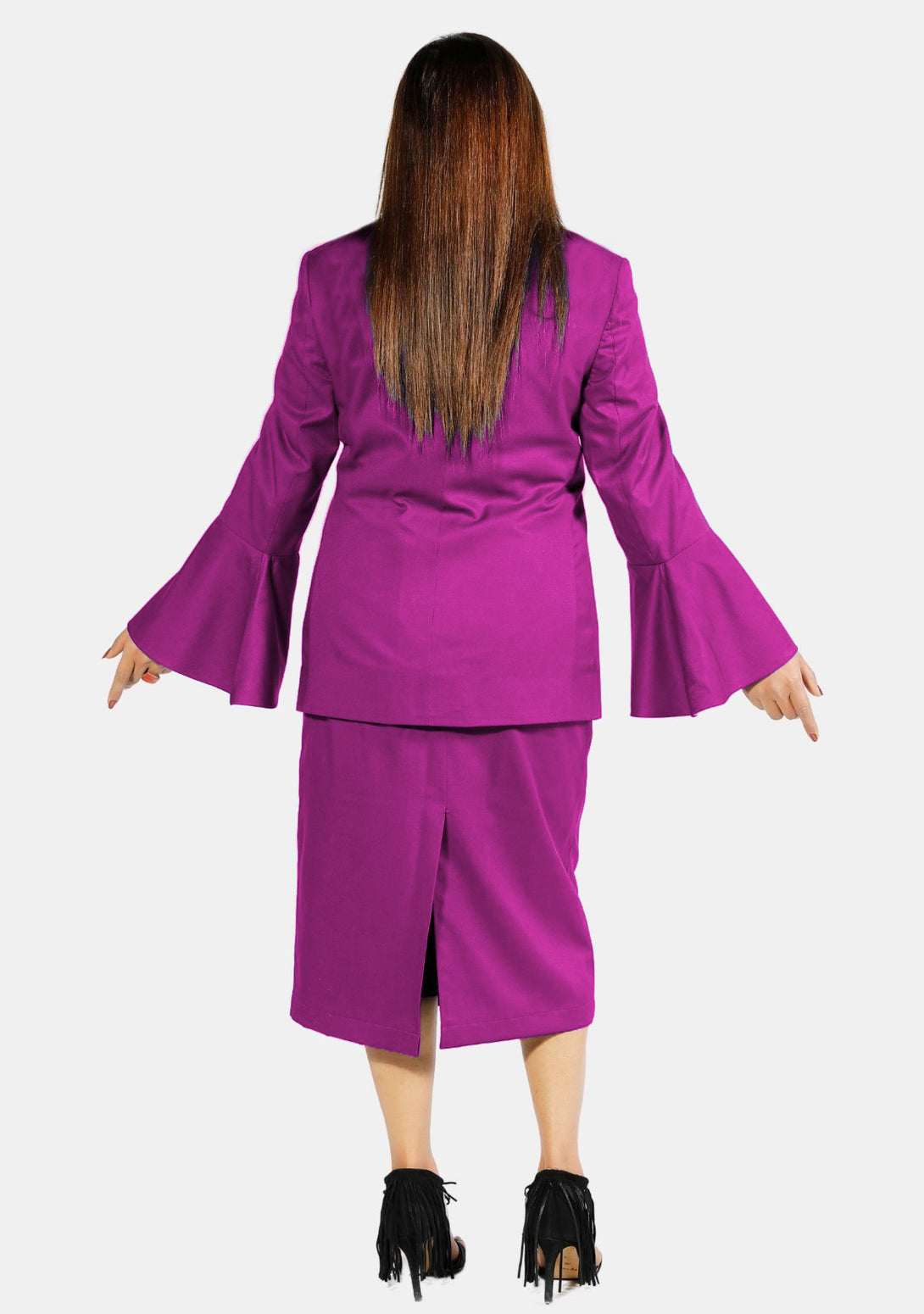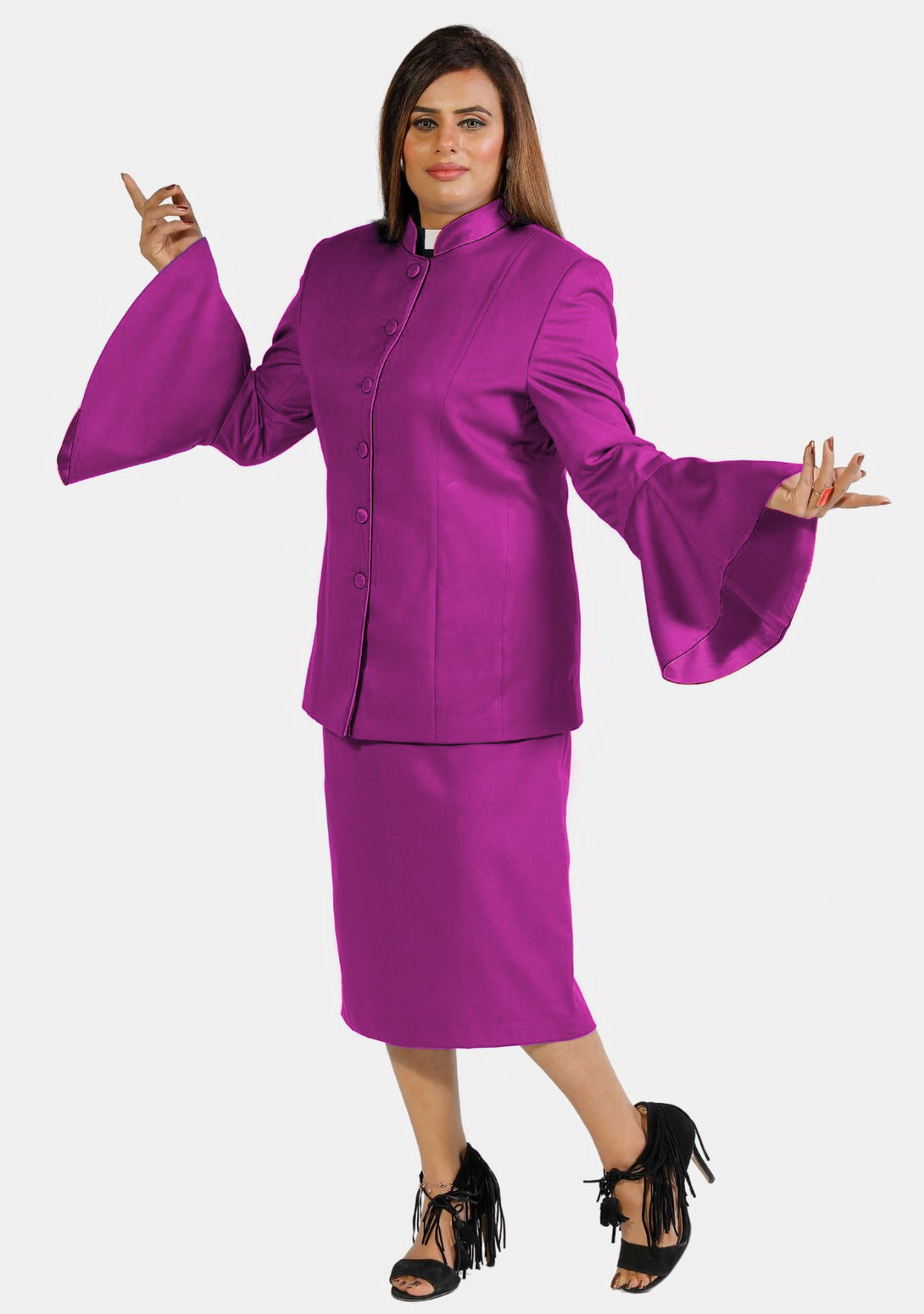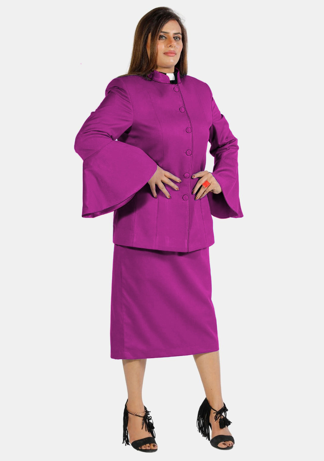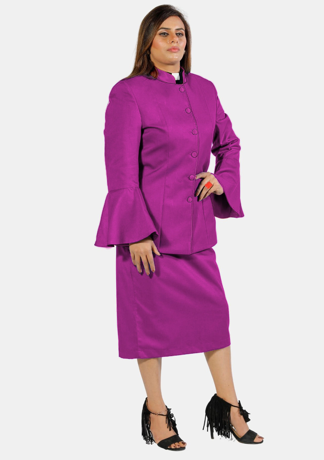 - Stylish jacket and skirt set designed for ministry wear.