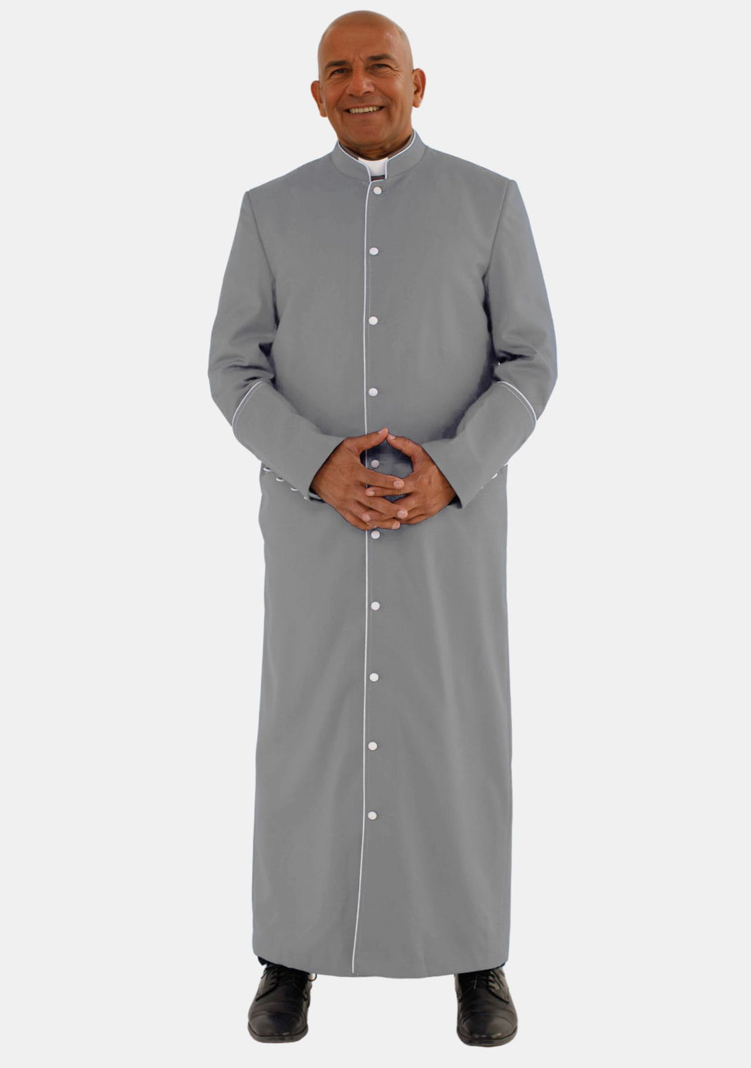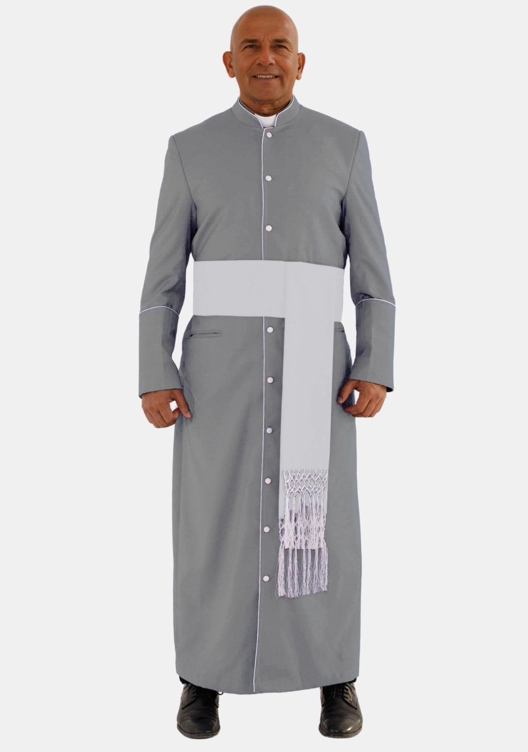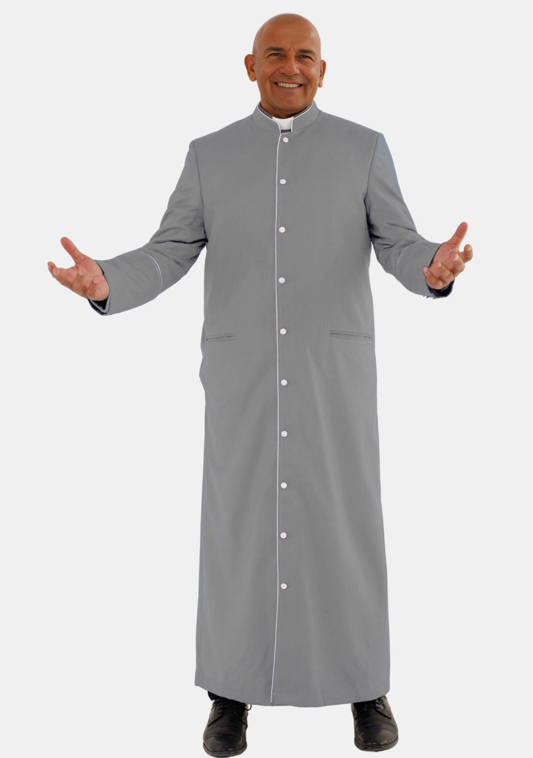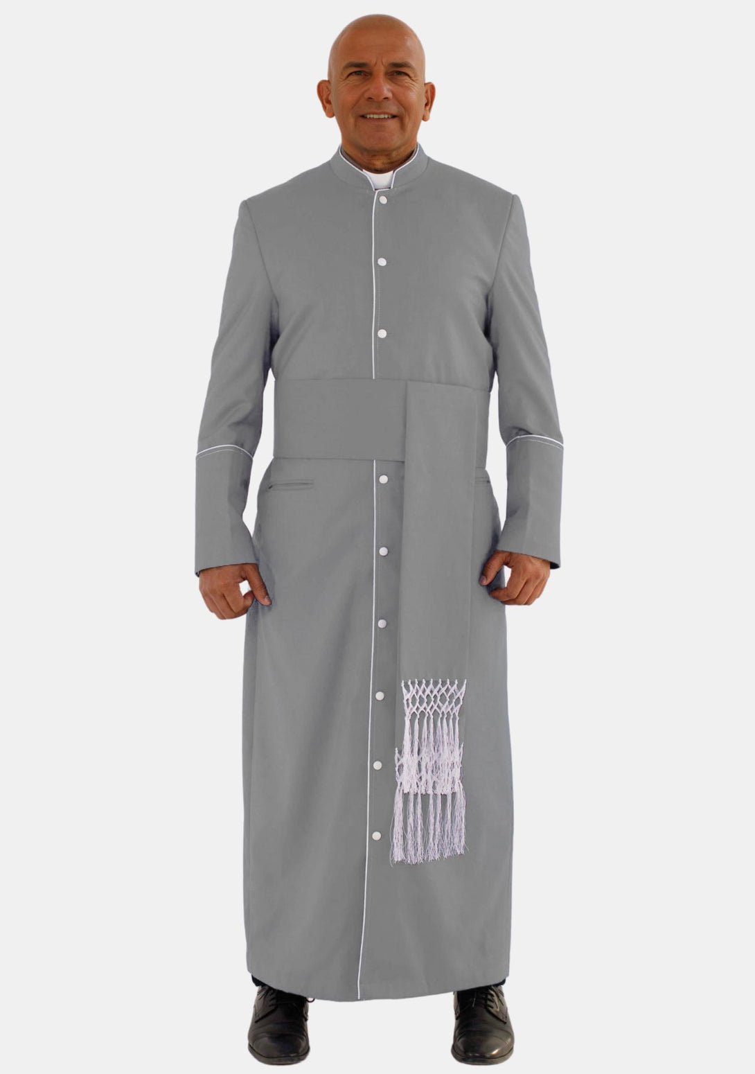 Tragen Sie die Gadiel-Geistlichenrobe in Grau mit Weiß. Jetzt einkaufen und auffallen!