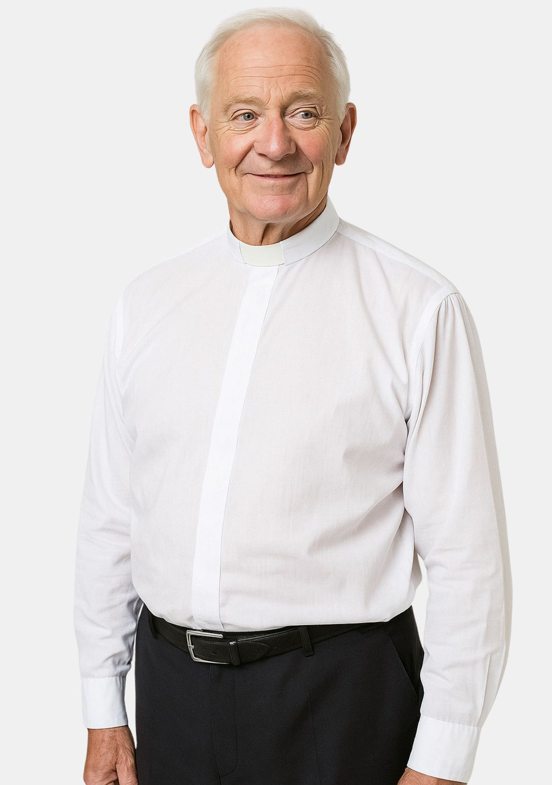 Merkmale des weißen Langarm-Clergy-Shirts mit Nackenband.