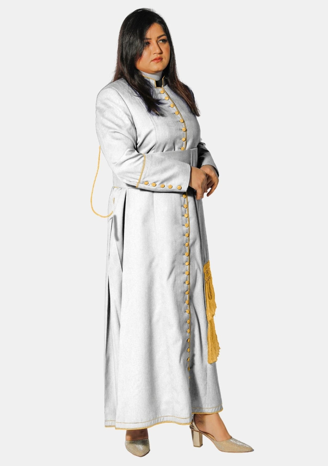 Weiße Soutane von eClergys für Damen. Diese exquisite, präzise gefertigte Priesterkleidung ist maßgeschneidert für Frauen in pastoralen Rollen. Nehmen Sie Ihre Berufung mit Anmut und Autorität an und setzen Sie ein starkes Zeichen, indem Sie selbstbewusst und elegant führen. Betonen Sie Ihre spirituelle Präsenz in dieser wunderschön gearbeiteten Soutane, perfekt für Pastorinnen und Pfarrerinnen.
