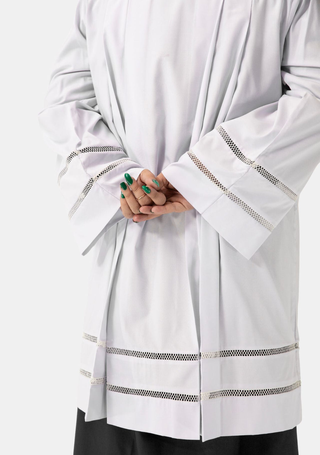 Unser Chorhemd hat vier Falten auf Vorder- und Rückseite. Diese Falten sorgen für ein ordentliches und übersichtliches Aussehen. Sie sorgen dafür, dass das Chorhemd schön fällt und Ihr Erscheinungsbild bei religiösen Veranstaltungen und Zeremonien unterstreicht.