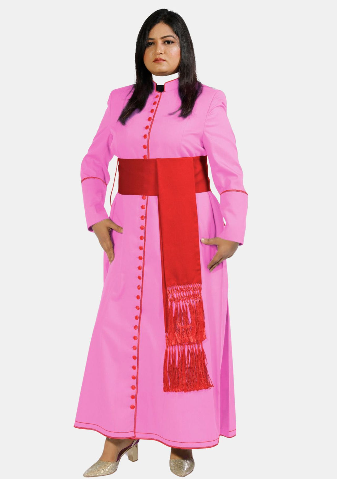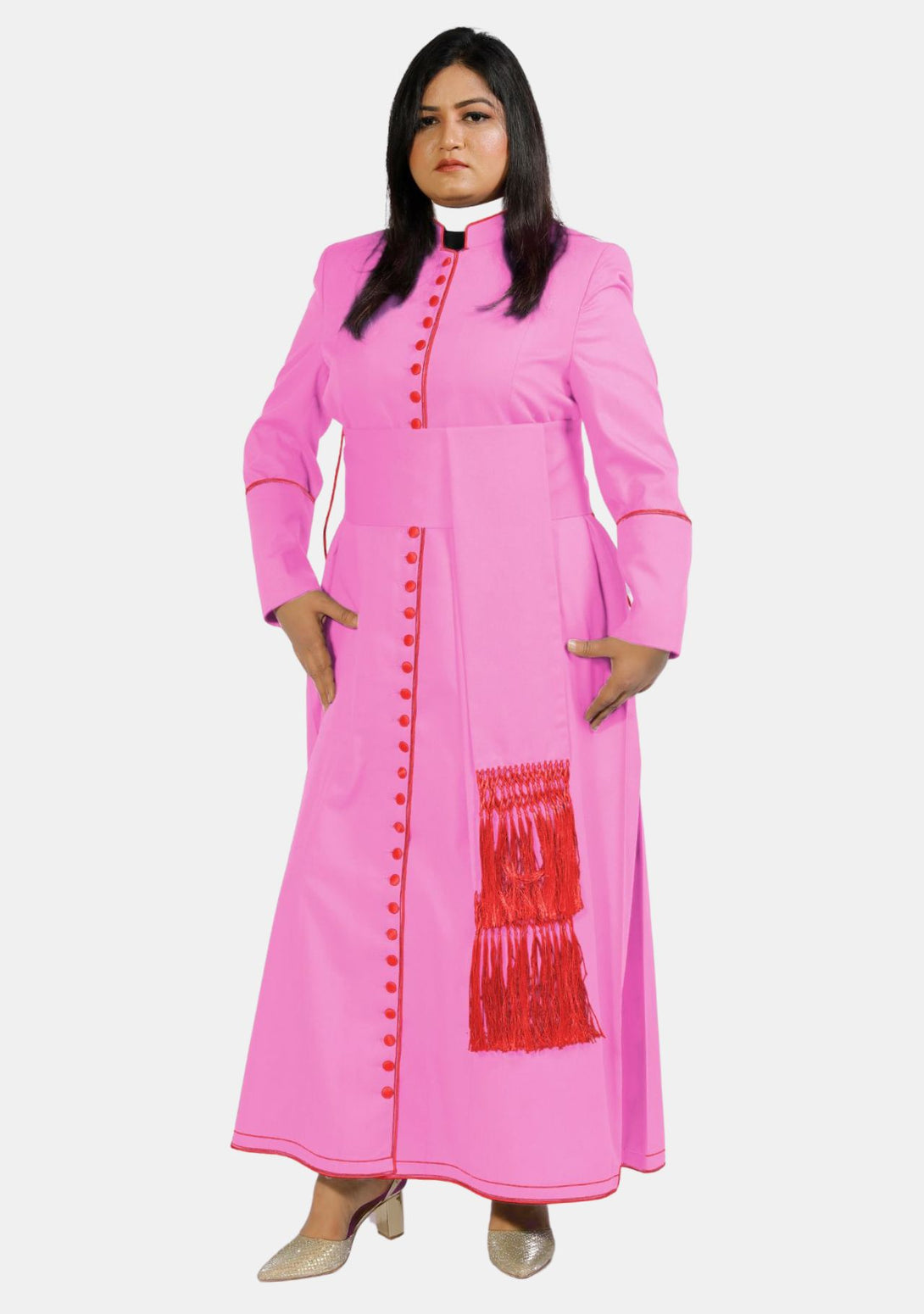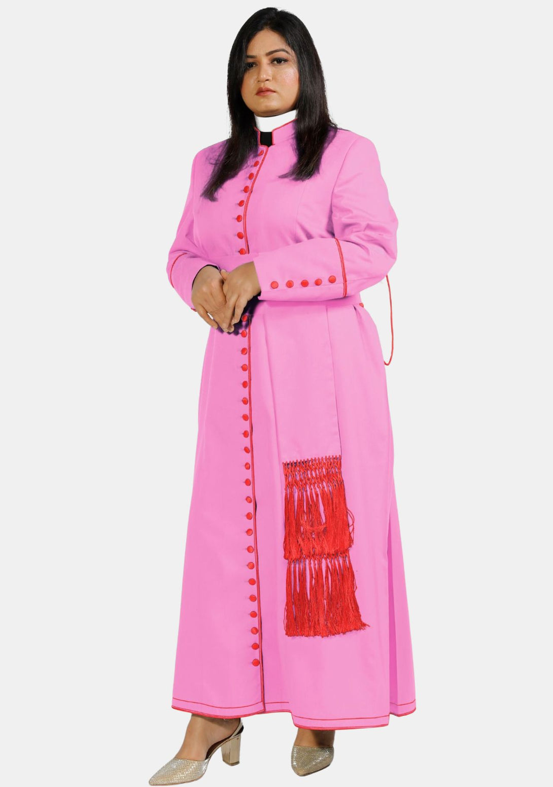 Die atemberaubende Damensoutane von eClergy in Rosa mit roten Kontrastknöpfen und -besatz ist ein wunderschön gearbeitetes Kleidungsstück, das Tradition mit einer mutigen, modernen Ästhetik verbindet. Diese farbenfrohe Soutane ist auf die Bedürfnisse von Geistlichen zugeschnitten, die sich einen Hauch von Individualität wünschen und gleichzeitig die Feierlichkeit ihrer Rolle wahren möchten. Perfekt für Gottesdienste, Zeremonien und formelle Anlässe – diese Soutane ist ein Statement, das Tradition respektiert und zeitgenössischen Stil verkörpert.