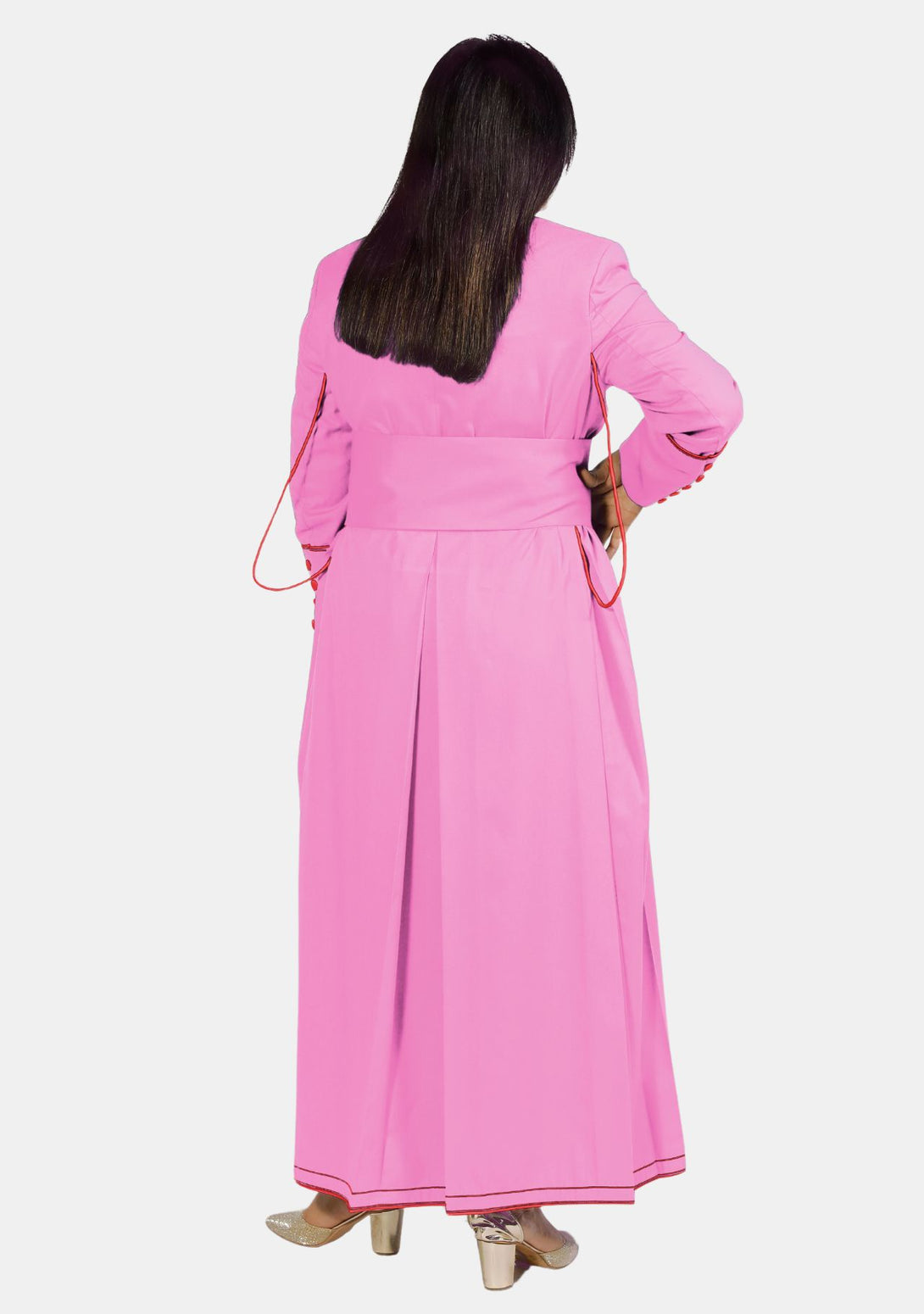 - Farbschema: Auffälliger rosa Stoff gepaart mit leuchtend roten Kontrastknöpfen und -besatz für ein einzigartiges und auffälliges Erscheinungsbild.