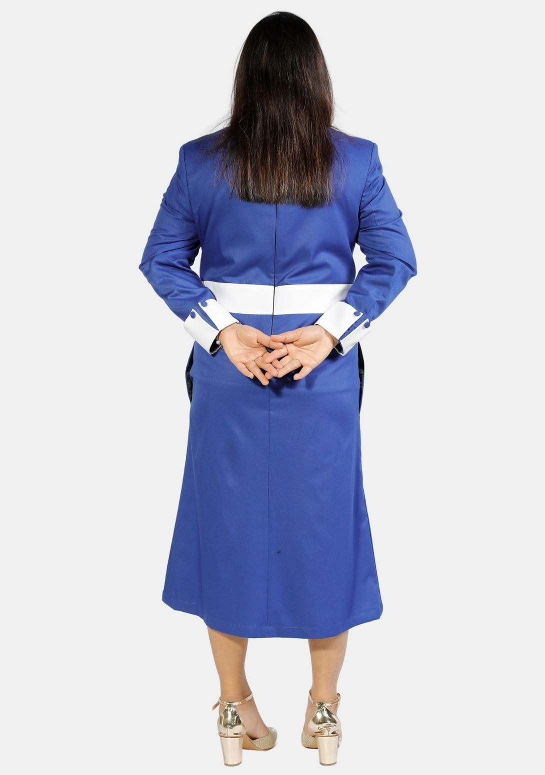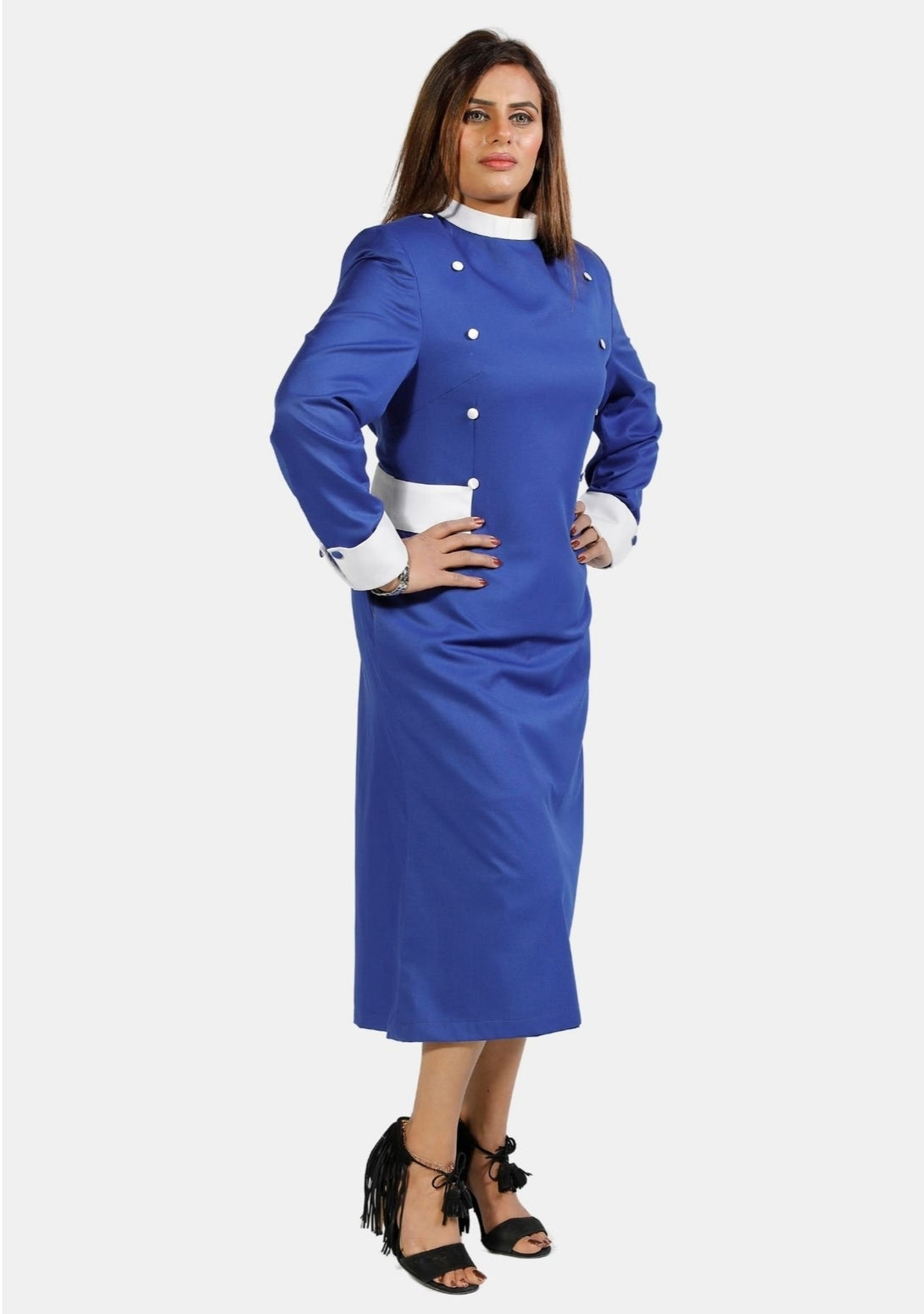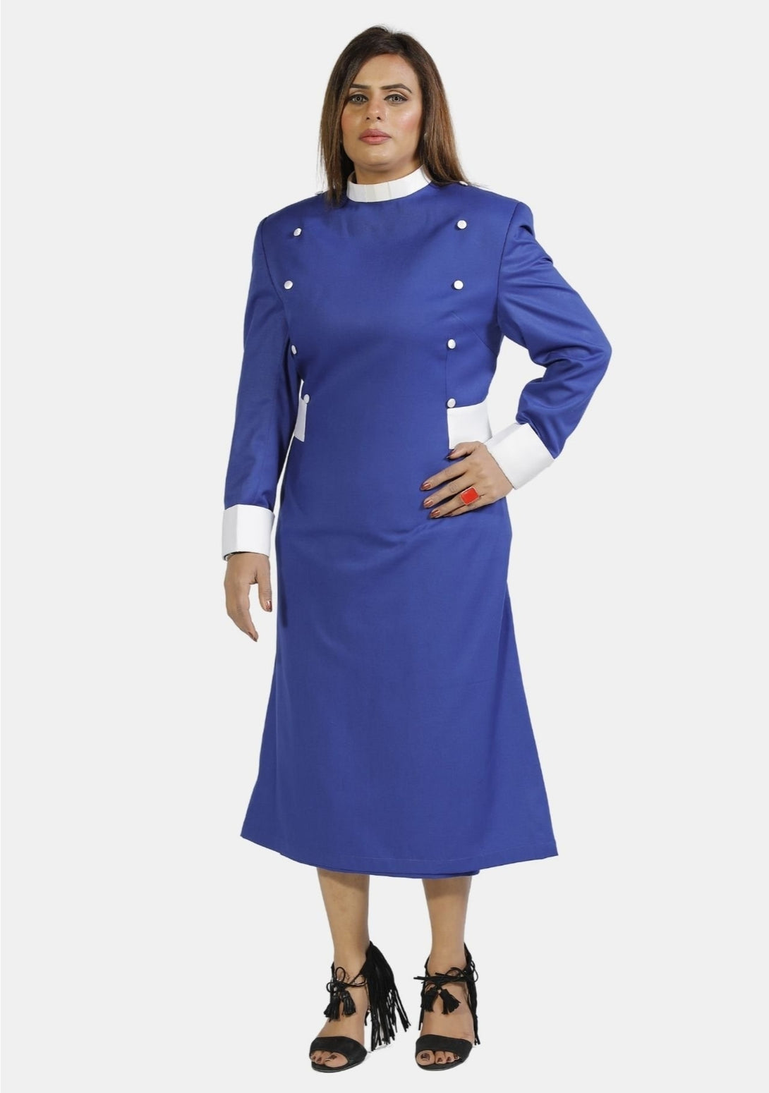Bestellen Sie Ihr Damen-Priesterkleid in Königsblau mit weißen Designerknöpfen !